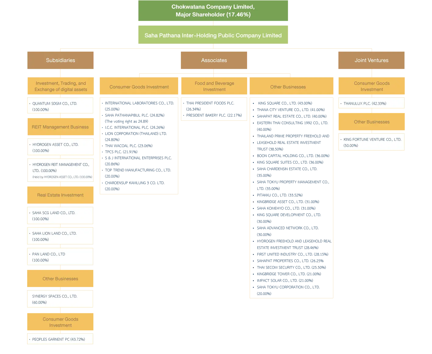 The Company invests in consumer goods businesses, food and beverage businesses, and industrial park development and others. As for the development of industrial parks for Saha Group, the Company is the sole operator. Its undertakings include land development for industrial use, land and/or building leasing service, and basic infrastructure and utilities inside the park.