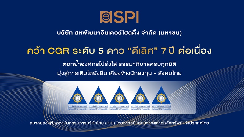 บริษัท สหพัฒนาอินเตอร์โฮลดิ้ง จำกัด (มหาชน) หรือ “SPI” ได้รับผลประเมิน การกำกับดูแลกิจการบริษัทจดทะเบียน (CGR) ประจำปี 2568 ในระดับ 5 ดาว “ดีเลิศ” ซึ่งเป็นระดับสูงสุด การประเมินจัดทำโดย สมาคมส่งเสริมสถาบันกรรมการบริษัทไทย (IOD) โดยได้รับการสนับสนุนจาก ตลาดหลักทรัพย์แห่งประเทศไทย
